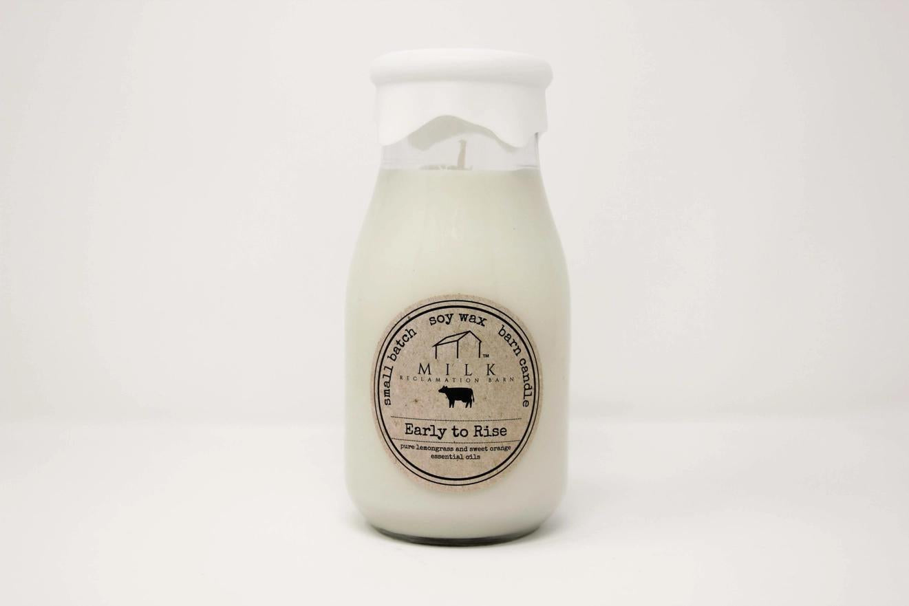 {"id":8676744528100,"title":"Milk Bottle Candle - Early to Rise","handle":"milk-bottle-candle-early-to-rise","description":"A tangy aroma of fresh oranges with the fresh and grassy scent of lemongrass.\u003cbr\u003e\u003cbr\u003eWe have repurposed the classic Milk Bottle into a beautiful soy candle. Breathe new life into a forgotten treasure. A delightful fusion of nostalgia and warmth for the home. Artisanal candles are hand poured with love and care inside a vintage style milk bottle. Each inspired fragrance has a story to tell.\u003cbr\u003e\u003cbr\u003eOur Milk Bottle Candles contain 100 percent American grown soy wax and a lead free all cotton wick. Each scent is specifically blended to evoke a memory of living here on the farm.\u003cbr\u003e\u003cbr\u003eEach candle contains 13 ounces of wax and produces a burn time of approximately 100 hours.\u003cbr\u003e\u003cbr\u003eMade in United States","published_at":"2025-07-04T21:38:19-04:00","created_at":"2025-07-04T21:38:18-04:00","vendor":"Milk Reclamation Barn","type":"Candles","tags":["Approx. Burn Time 100 hours","Candle","Clean Burn","Cotton Wick","Made in USA","Milk Reclamation Barn","Soy Candle"],"price":2390,"price_min":2390,"price_max":2390,"available":false,"price_varies":false,"compare_at_price":null,"compare_at_price_min":0,"compare_at_price_max":0,"compare_at_price_varies":false,"variants":[{"id":46459199553764,"title":"Default Title","option1":"Default Title","option2":null,"option3":null,"sku":null,"requires_shipping":true,"taxable":true,"featured_image":null,"available":false,"name":"Milk Bottle Candle - Early to Rise","public_title":null,"options":["Default Title"],"price":2390,"weight":680,"compare_at_price":null,"inventory_quantity":-1,"inventory_management":"shopify","inventory_policy":"deny","barcode":"619775206410","requires_selling_plan":false,"selling_plan_allocations":[]}],"images":["\/\/www.spottedmoon.com\/cdn\/shop\/files\/fca06ae6-e9b5-41d7-9b3d-75d3bcfd8df3.jpg?v=1751679504","\/\/www.spottedmoon.com\/cdn\/shop\/files\/8d4661bb-9835-4283-b0c8-0a19ba23649a.jpg?v=1751679504"],"featured_image":"\/\/www.spottedmoon.com\/cdn\/shop\/files\/fca06ae6-e9b5-41d7-9b3d-75d3bcfd8df3.jpg?v=1751679504","options":["Title"],"media":[{"alt":null,"id":65837224296676,"position":1,"preview_image":{"aspect_ratio":0.715,"height":881,"width":630,"src":"\/\/www.spottedmoon.com\/cdn\/shop\/files\/fca06ae6-e9b5-41d7-9b3d-75d3bcfd8df3.jpg?v=1751679504"},"aspect_ratio":0.715,"height":881,"media_type":"image","src":"\/\/www.spottedmoon.com\/cdn\/shop\/files\/fca06ae6-e9b5-41d7-9b3d-75d3bcfd8df3.jpg?v=1751679504","width":630},{"alt":null,"id":65837225214180,"position":2,"preview_image":{"aspect_ratio":1.499,"height":881,"width":1321,"src":"\/\/www.spottedmoon.com\/cdn\/shop\/files\/8d4661bb-9835-4283-b0c8-0a19ba23649a.jpg?v=1751679504"},"aspect_ratio":1.499,"height":881,"media_type":"image","src":"\/\/www.spottedmoon.com\/cdn\/shop\/files\/8d4661bb-9835-4283-b0c8-0a19ba23649a.jpg?v=1751679504","width":1321}],"requires_selling_plan":false,"selling_plan_groups":[],"content":"A tangy aroma of fresh oranges with the fresh and grassy scent of lemongrass.\u003cbr\u003e\u003cbr\u003eWe have repurposed the classic Milk Bottle into a beautiful soy candle. Breathe new life into a forgotten treasure. A delightful fusion of nostalgia and warmth for the home. Artisanal candles are hand poured with love and care inside a vintage style milk bottle. Each inspired fragrance has a story to tell.\u003cbr\u003e\u003cbr\u003eOur Milk Bottle Candles contain 100 percent American grown soy wax and a lead free all cotton wick. Each scent is specifically blended to evoke a memory of living here on the farm.\u003cbr\u003e\u003cbr\u003eEach candle contains 13 ounces of wax and produces a burn time of approximately 100 hours.\u003cbr\u003e\u003cbr\u003eMade in United States"}