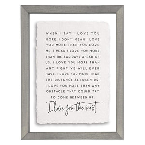 {"id":8693175091428,"title":"Love You The Most - Floating Wall Art Rectangle","handle":"love-you-the-most-floating-wall-art-rectangle","description":"\u003cp\u003eThis piece is composed of a solid wood frame that secures the elegant design on paper mâché between two pieces of plexiglass. The depth of the frame also allows for tabletop display or a wall hanging application.\u003cbr\u003e \u003cbr\u003e14\" x 11\" x 1.5\"\u003cbr\u003e\u003cbr\u003eProudly designed, printed, and made in the USA by Sincere Surroundings.\u003c\/p\u003e\n\u003cp\u003eText found in image:\u003c\/p\u003e\n\u003cp\u003eWHEN I SAY I LOVE YOU MORE. I DON'T MEAN I LOVE YOU MORE THAN YOU LOVE ME. I MEAN I LOVE YOU MORE THAN THE BAD DAYS AHEAD OF US. I LOVE YOU MORE THAN ANY FIGHT WE WILL EVER HAVE. I LOVE YOU MORE THAN THE DISTANCE BETWEEN US. I LOVE YOU MORE THAN ANY OBSTACLE THAT COULD TRY TO COME BETWEEN US.\u003c\/p\u003e\n\u003cp\u003eI love you the most.\u003c\/p\u003e\n\u003cp\u003eColors:\u003c\/p\u003e\n\u003cp\u003eGray, white, black\u003c\/p\u003e\n\u003cp\u003eAdditional Info:\u003c\/p\u003e\n\u003cp\u003eTheme: Love and devotion (An elegant and heartfelt piece of wall art that beautifully expresses deep and unwavering love.) - romantic, relationship, commitment, sentiment, heartfelt, elegant, gift, home decor, affectionate, meaningful\u003c\/p\u003e","published_at":"2025-07-25T22:29:06-04:00","created_at":"2025-07-25T22:29:05-04:00","vendor":"Sincere Surroundings","type":"Floating Wall Art","tags":["Affectionate","Commitment","Decor","Floating Wall Art","Gift","Heartfelt","Home Decor","Made in USA","Romantic","Sentiment","Sincere Surroundings"],"price":3500,"price_min":3500,"price_max":3500,"available":true,"price_varies":false,"compare_at_price":null,"compare_at_price_min":0,"compare_at_price_max":0,"compare_at_price_varies":false,"variants":[{"id":46529798078692,"title":"Default Title","option1":"Default Title","option2":null,"option3":null,"sku":"FAR1026","requires_shipping":true,"taxable":true,"featured_image":null,"available":true,"name":"Love You The Most - Floating Wall Art Rectangle","public_title":null,"options":["Default Title"],"price":3500,"weight":1361,"compare_at_price":null,"inventory_quantity":1,"inventory_management":"shopify","inventory_policy":"deny","barcode":"840136629481","requires_selling_plan":false,"selling_plan_allocations":[]}],"images":["\/\/www.spottedmoon.com\/cdn\/shop\/files\/3d3bab2a-7897-4594-abf6-6fcb7da434ac.jpg?v=1753496950"],"featured_image":"\/\/www.spottedmoon.com\/cdn\/shop\/files\/3d3bab2a-7897-4594-abf6-6fcb7da434ac.jpg?v=1753496950","options":["Title"],"media":[{"alt":null,"id":66078107173092,"position":1,"preview_image":{"aspect_ratio":1.001,"height":881,"width":882,"src":"\/\/www.spottedmoon.com\/cdn\/shop\/files\/3d3bab2a-7897-4594-abf6-6fcb7da434ac.jpg?v=1753496950"},"aspect_ratio":1.001,"height":881,"media_type":"image","src":"\/\/www.spottedmoon.com\/cdn\/shop\/files\/3d3bab2a-7897-4594-abf6-6fcb7da434ac.jpg?v=1753496950","width":882}],"requires_selling_plan":false,"selling_plan_groups":[],"content":"\u003cp\u003eThis piece is composed of a solid wood frame that secures the elegant design on paper mâché between two pieces of plexiglass. The depth of the frame also allows for tabletop display or a wall hanging application.\u003cbr\u003e \u003cbr\u003e14\" x 11\" x 1.5\"\u003cbr\u003e\u003cbr\u003eProudly designed, printed, and made in the USA by Sincere Surroundings.\u003c\/p\u003e\n\u003cp\u003eText found in image:\u003c\/p\u003e\n\u003cp\u003eWHEN I SAY I LOVE YOU MORE. I DON'T MEAN I LOVE YOU MORE THAN YOU LOVE ME. I MEAN I LOVE YOU MORE THAN THE BAD DAYS AHEAD OF US. I LOVE YOU MORE THAN ANY FIGHT WE WILL EVER HAVE. I LOVE YOU MORE THAN THE DISTANCE BETWEEN US. I LOVE YOU MORE THAN ANY OBSTACLE THAT COULD TRY TO COME BETWEEN US.\u003c\/p\u003e\n\u003cp\u003eI love you the most.\u003c\/p\u003e\n\u003cp\u003eColors:\u003c\/p\u003e\n\u003cp\u003eGray, white, black\u003c\/p\u003e\n\u003cp\u003eAdditional Info:\u003c\/p\u003e\n\u003cp\u003eTheme: Love and devotion (An elegant and heartfelt piece of wall art that beautifully expresses deep and unwavering love.) - romantic, relationship, commitment, sentiment, heartfelt, elegant, gift, home decor, affectionate, meaningful\u003c\/p\u003e"}