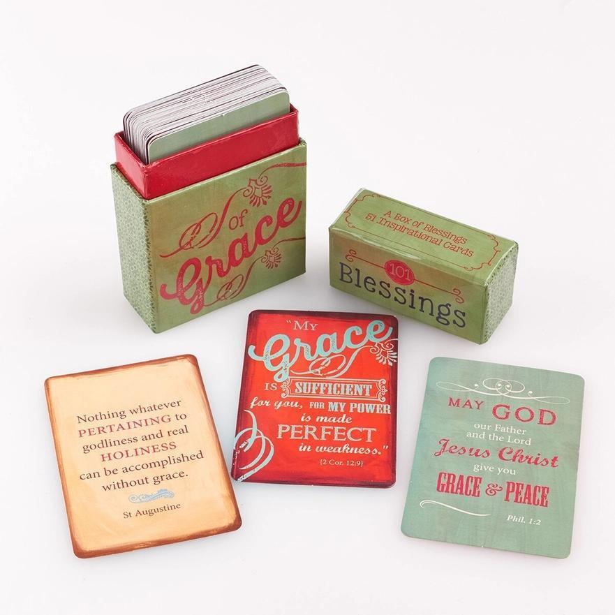 {"id":8905458745572,"title":"Box of Blessings - Blessings of Grace","handle":"box-of-blessings-blessings-of-grace","description":"\u003cp\u003ePractice the art of gratitude as you work your way through the cards in the \u003cem\u003e101 Blessings of Grace Box of Blessings\u003c\/em\u003e.\u003c\/p\u003e\n\u003cp\u003eThe retro-inspired box with its tight-fitting lid shows faded red text, simple embellishments, and curlicues printed against a slightly mottled green background.\u003c\/p\u003e\n\u003cp\u003e\u003cem\u003e\u003cstrong\u003e101 Blessings of Grace\u003c\/strong\u003e\u003c\/em\u003e\u003cbr\u003e\u003cem\u003e101 messages to encourage and inspire\u003c\/em\u003e\u003c\/p\u003e\n\u003cp\u003eThe 51 double-sided cards in the box are decorated in three vintage designs with a red, tan, blue, and green color scheme. Cards feature grace-centered verses from Scripture and quotes about grace. The small Box of Blessings®, roughly the size of a deck of cards, makes it perfect for storing on a desk or in a bag.\u003c\/p\u003e\n\u003cp\u003eKeep the\u003cem\u003e 101 Blessings of Grace Box of Blessings\u003c\/em\u003e for yourself to pass out the cards individually to friends or strangers as you feel called to, add an applicable card to a birthday card or thank you note, or give the \u003cem\u003e101 Blessings of Grace Box of Blessings\u003c\/em\u003e to friends in ministry to use for outreach. \u003c\/p\u003e\n\u003cp\u003eVintage green and red design\u003c\/p\u003e\n\u003cul\u003e\n\u003cli\u003eRed and blue screen-printed title\u003c\/li\u003e\n\u003cli\u003eFull-color printed cards and box\u003c\/li\u003e\n\u003cli\u003e51 double-sided cards\u003c\/li\u003e\n\u003cli\u003eRed, green, blue, and tan color scheme\u003c\/li\u003e\n\u003cli\u003eInspirational quotes and Bible verses\u003c\/li\u003e\n\u003cli\u003eShrink-wrapped\u003c\/li\u003e\n\u003cli\u003eSturdy box with lid\u003c\/li\u003e\n\u003cli\u003eCard size: 3.4\" x 2.3\" (86 x 58mm)\u003c\/li\u003e\n\u003cli\u003eBox size: 3.8\" x 2.7\" x 1.1\" (97 x 69 x 28mm)\u003c\/li\u003e\n\u003c\/ul\u003e","published_at":"2026-01-31T14:32:44-05:00","created_at":"2026-01-31T14:32:42-05:00","vendor":"Christian Art Gifts","type":"Box of Blessings Scripture","tags":["Box of Blessings","Christian Art Gifts","Gift","Grace","Grace Centered Verses","Inspirational Message","Scripture","Vintage Design"],"price":499,"price_min":499,"price_max":499,"available":true,"price_varies":false,"compare_at_price":null,"compare_at_price_min":0,"compare_at_price_max":0,"compare_at_price_varies":false,"variants":[{"id":47526983827684,"title":"Default Title","option1":"Default Title","option2":null,"option3":null,"sku":"BX082","requires_shipping":true,"taxable":true,"featured_image":null,"available":true,"name":"Box of Blessings - Blessings of Grace","public_title":null,"options":["Default Title"],"price":499,"weight":170,"compare_at_price":null,"inventory_quantity":2,"inventory_management":"shopify","inventory_policy":"deny","barcode":"6006937115828","requires_selling_plan":false,"selling_plan_allocations":[]}],"images":["\/\/www.spottedmoon.com\/cdn\/shop\/files\/a277a76d-b5b1-4da4-8c4c-bb883e1da5eb.webp?v=1769887968","\/\/www.spottedmoon.com\/cdn\/shop\/files\/7f5799e4-5d6f-40f5-aa5b-4a815cd9bfd0.webp?v=1769887968","\/\/www.spottedmoon.com\/cdn\/shop\/files\/9615bc21-b1ca-43ed-83ae-c385bebe64f7.webp?v=1769887968","\/\/www.spottedmoon.com\/cdn\/shop\/files\/c787d94a-e9dd-48e5-9d17-d44c984b49d9.webp?v=1769887969"],"featured_image":"\/\/www.spottedmoon.com\/cdn\/shop\/files\/a277a76d-b5b1-4da4-8c4c-bb883e1da5eb.webp?v=1769887968","options":["Title"],"media":[{"alt":null,"id":68390722502884,"position":1,"preview_image":{"aspect_ratio":1.0,"height":881,"width":881,"src":"\/\/www.spottedmoon.com\/cdn\/shop\/files\/a277a76d-b5b1-4da4-8c4c-bb883e1da5eb.webp?v=1769887968"},"aspect_ratio":1.0,"height":881,"media_type":"image","src":"\/\/www.spottedmoon.com\/cdn\/shop\/files\/a277a76d-b5b1-4da4-8c4c-bb883e1da5eb.webp?v=1769887968","width":881},{"alt":null,"id":68390722535652,"position":2,"preview_image":{"aspect_ratio":1.0,"height":881,"width":881,"src":"\/\/www.spottedmoon.com\/cdn\/shop\/files\/7f5799e4-5d6f-40f5-aa5b-4a815cd9bfd0.webp?v=1769887968"},"aspect_ratio":1.0,"height":881,"media_type":"image","src":"\/\/www.spottedmoon.com\/cdn\/shop\/files\/7f5799e4-5d6f-40f5-aa5b-4a815cd9bfd0.webp?v=1769887968","width":881},{"alt":null,"id":68390722568420,"position":3,"preview_image":{"aspect_ratio":1.0,"height":881,"width":881,"src":"\/\/www.spottedmoon.com\/cdn\/shop\/files\/9615bc21-b1ca-43ed-83ae-c385bebe64f7.webp?v=1769887968"},"aspect_ratio":1.0,"height":881,"media_type":"image","src":"\/\/www.spottedmoon.com\/cdn\/shop\/files\/9615bc21-b1ca-43ed-83ae-c385bebe64f7.webp?v=1769887968","width":881},{"alt":null,"id":68390722601188,"position":4,"preview_image":{"aspect_ratio":1.0,"height":881,"width":881,"src":"\/\/www.spottedmoon.com\/cdn\/shop\/files\/c787d94a-e9dd-48e5-9d17-d44c984b49d9.webp?v=1769887969"},"aspect_ratio":1.0,"height":881,"media_type":"image","src":"\/\/www.spottedmoon.com\/cdn\/shop\/files\/c787d94a-e9dd-48e5-9d17-d44c984b49d9.webp?v=1769887969","width":881}],"requires_selling_plan":false,"selling_plan_groups":[],"content":"\u003cp\u003ePractice the art of gratitude as you work your way through the cards in the \u003cem\u003e101 Blessings of Grace Box of Blessings\u003c\/em\u003e.\u003c\/p\u003e\n\u003cp\u003eThe retro-inspired box with its tight-fitting lid shows faded red text, simple embellishments, and curlicues printed against a slightly mottled green background.\u003c\/p\u003e\n\u003cp\u003e\u003cem\u003e\u003cstrong\u003e101 Blessings of Grace\u003c\/strong\u003e\u003c\/em\u003e\u003cbr\u003e\u003cem\u003e101 messages to encourage and inspire\u003c\/em\u003e\u003c\/p\u003e\n\u003cp\u003eThe 51 double-sided cards in the box are decorated in three vintage designs with a red, tan, blue, and green color scheme. Cards feature grace-centered verses fr